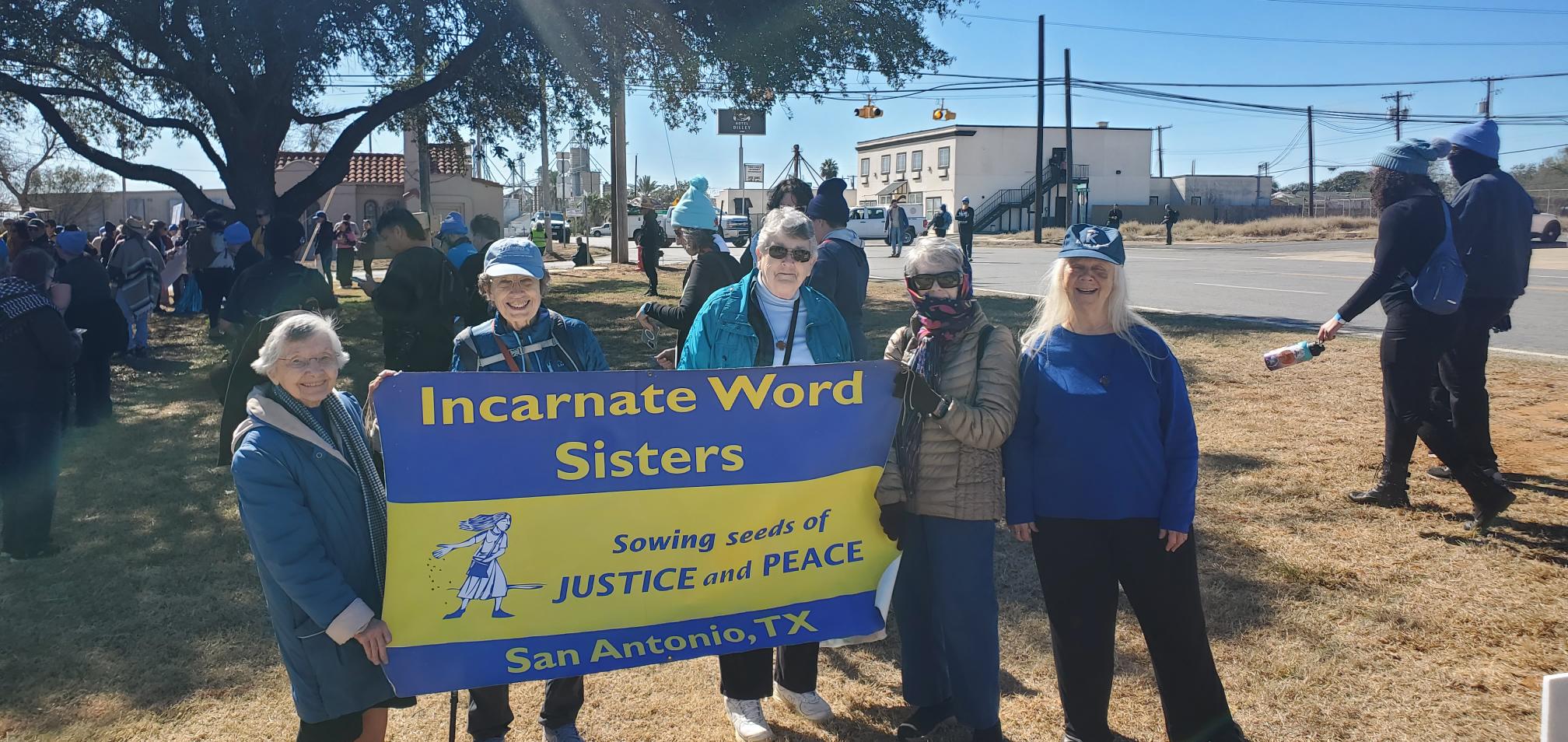 The Texas Unitarian Universalist Justice Ministry led by Rev. Erin Walter started to organize the vigil when they found out that U.S. Rep. Joaquin Castro from San Antonio and U.S. Rep. Jasmine Crockett of Dallas were going to be visiting there. In only three days this successful and touching gathering was put together. Many clergy and faith leaders, a Franciscan, Protestant ministers, our Incarnate Word Sisters, Sister of the Holy Spirit, and Daughters of Charity participated. A woman from Dilley asked us not to call the government facility the Dilley Detention Center. The people of Dilley with many of their churches hosting us, did not want for us to think of them as the people behind what was going on at the detention center.